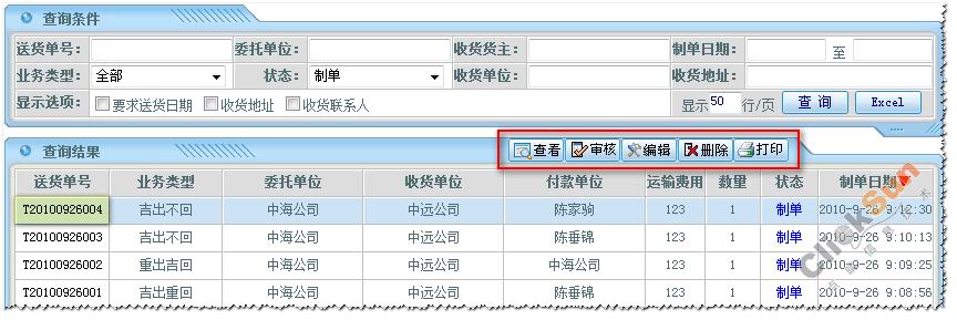 在查詢結(jié)果列表中,點擊各顯示項名稱,查詢結(jié)果列表中的內(nèi)容便以點擊的顯示項字段進(jìn)行排序,如下圖所示,按“送貨單號”升序排序顯示。若再次點擊“送貨單號”,系統(tǒng)會按“送貨單號”降序排序顯示。