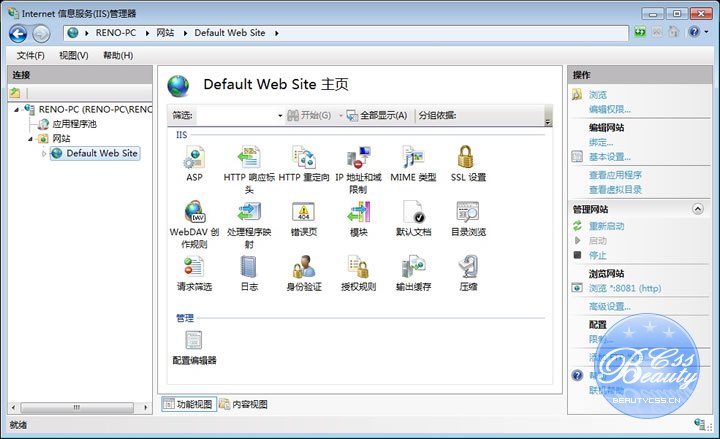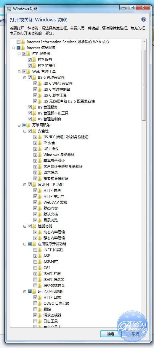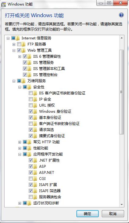 安裝方法3: (圖文)需要有win7的安裝盤,不是ghost版的,目前還沒有發(fā)現(xiàn)有iis7.0安裝包 一、安裝IIS 默認情況下,windows7安裝時是不會自動安裝iis,只能手動安裝。 1.安裝IIS 開始-控制面板-程序-打開或關(guān)閉windows功能 2.如圖選擇安裝 VS2005 中,如果要調(diào)試站點的話,必須有“Windows身份驗證” “摘要式身份驗證” 是使用 Windows 域控制器對請求訪問 Web 服務器上內(nèi)容的用戶進行身份證。 “基本身份驗證” 是要求用戶提供有效的用戶名和密碼才能訪問內(nèi)容。 要調(diào)試 ASP.net 當然要安裝IIS支持 ASP.net 的組件了。 二、配置IIS7 管理工具,打開運行。如下圖: 2、雙擊內(nèi)頁中的ASP,即顯示ASP的設(shè)置內(nèi)容,",然后在"Behavior(行為)"組中將"Enable Parent Paths(啟用父路徑)"設(shè)置為True即可。 3、配置默認網(wǎng)站 4、填寫 物理路徑、應用程序池,點OK即可: IIS 的應用程序池根據(jù)托管管道模式分了兩種類型:集成和經(jīng)典 一個偶然的機會,我發(fā)現(xiàn)了網(wǎng)上有些高手已經(jīng)發(fā)布了一些相關(guān)的信息,于是我就站在“巨人”的肩上開始設(shè)置我電腦上的IIS,以下是高手們的設(shè)置方法(還有我個人的一些體會),希望能對你有所幫助??! 一、首先打開Win7控制面板,單擊“程序和功能”,然后選擇左側(cè)的“打開或關(guān)閉Windows功能”。 二、現(xiàn)在出現(xiàn)了安裝Windows功能的選項菜單,注意選擇的項目,我們需要手動選擇需要的功能,下面這張圖片把需要安裝的服務都已經(jīng)選擇了,大家可以按照圖片勾選功能。 三、安裝完成后,再次進入控制面板,選擇“管理工具”,進入后雙擊 Internet(IIS)管理器選項,進入IIS設(shè)置。(注意是“ Internet(IIS)管理器”而不是“ Internet(IIS)6.0管理器,至于有什么差別,我也沒有試過,你如果有空可以試試) 四、現(xiàn)在進入到IIS的控制面板。