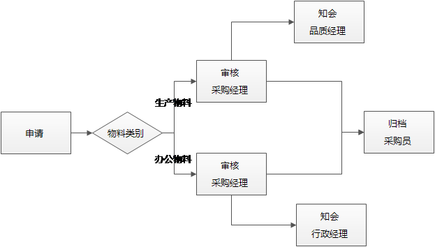 ![]() ![]() 點(diǎn)晴OA工作流流程設(shè)計(jì)時(shí)不直接支持條件跳轉(zhuǎn)到知會(huì)節(jié)點(diǎn),條件跳轉(zhuǎn)只支持審核節(jié)點(diǎn),所以要實(shí)現(xiàn)知會(huì)節(jié)點(diǎn)的條件跳轉(zhuǎn),必須先通過審核節(jié)點(diǎn)來跳轉(zhuǎn),管理員在設(shè)計(jì)審核節(jié)點(diǎn)時(shí),就必須考慮到如何實(shí)現(xiàn)之后的知會(huì)動(dòng)作。 例如: 如果申請(qǐng)人申請(qǐng)采購某種物料,生產(chǎn)性物料要知會(huì)品質(zhì)部經(jīng)理,辦公用物料要知會(huì)行政經(jīng)理,但都是由采購經(jīng)理審核,那么應(yīng)該在申請(qǐng)環(huán)節(jié)增加一個(gè)采購物料類別的字段,并將審核節(jié)點(diǎn)拆分為兩個(gè)審核節(jié)點(diǎn),審核人都是采購部經(jīng)理,這樣申請(qǐng)生產(chǎn)性物料時(shí),采購經(jīng)理審核完畢后,就會(huì)知會(huì)品質(zhì)部經(jīng)理;申請(qǐng)辦公用物料時(shí),就會(huì)知會(huì)行政經(jīng)理了。 ![]() 該文章在 2017/11/16 14:34:12 編輯過