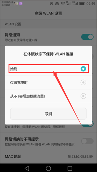 4.1. 點(diǎn)擊“設(shè)置 > WLAN > 高級(jí)設(shè)置 > 在休眠狀態(tài)下保持WLAN連接”。