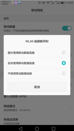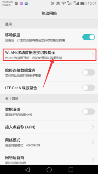 4.2.2、進(jìn)入菜單后——選擇移動(dòng)網(wǎng)絡(luò),4.2.3、選擇“WLAN/移動(dòng)數(shù)據(jù)連接切換提示”,4.2.4、點(diǎn)擊選擇“自動(dòng)使用移動(dòng)數(shù)據(jù)連接”,如下圖所示: