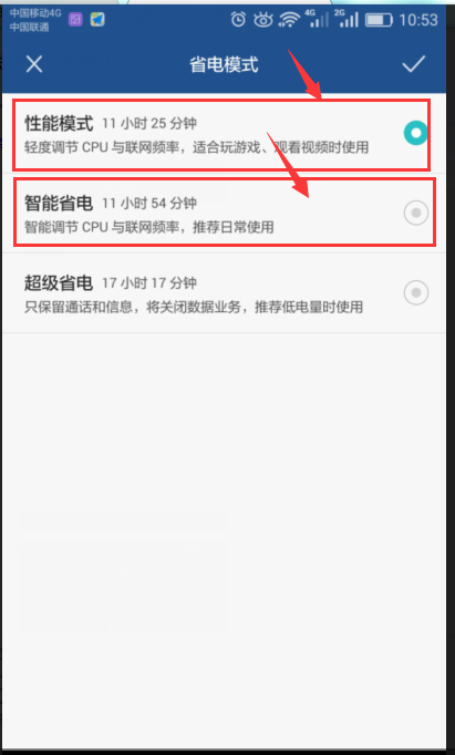 6.1、選擇手機(jī)管家,進(jìn)入頁面 6.2、進(jìn)入頁面——選擇電池管理 6.3、進(jìn)入頁面——點(diǎn)擊“省電模式” 6.4、進(jìn)入頁面——選擇“性能省電或者智能省電”,如下圖所示: