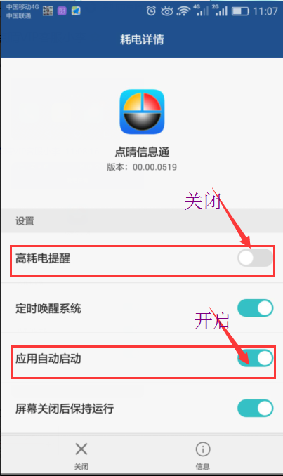 、當(dāng)有點(diǎn)晴信息通高耗電提醒的時(shí)候,選擇不再提示,不要關(guān)閉應(yīng)用。點(diǎn)擊“設(shè)置 > 應(yīng)用管理 > 點(diǎn)晴信息通 > 電池”,選擇關(guān)閉高耗電提醒。 (僅EMUI4.0以上平臺(tái)適用)