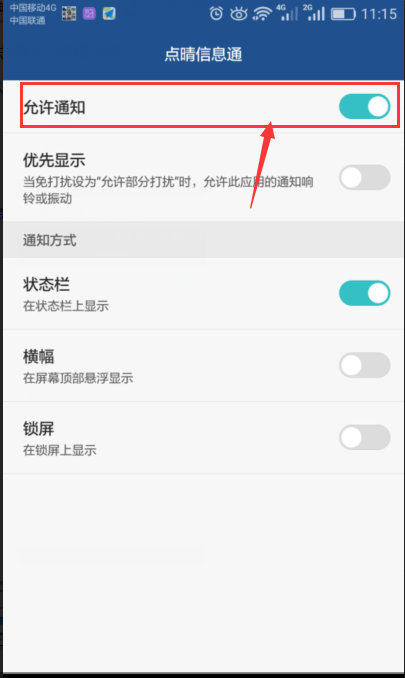 MUI4.0及EMUI4.1:“設(shè)置 > 通知欄和狀態(tài)欄 > 通知中心 > 點(diǎn)晴信息通”。