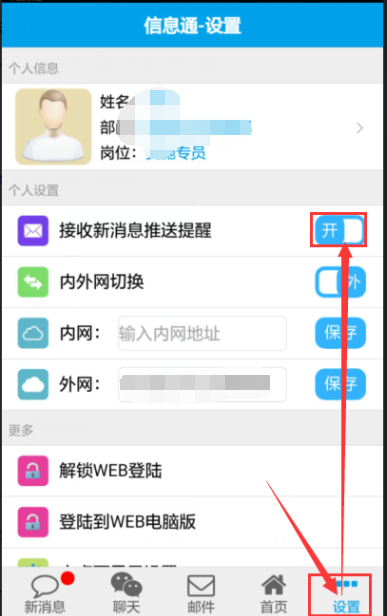3.1.開啟點(diǎn)晴信息通應(yīng)用內(nèi)部的通知功能,“設(shè)置 -> 開啟新消息提醒”;