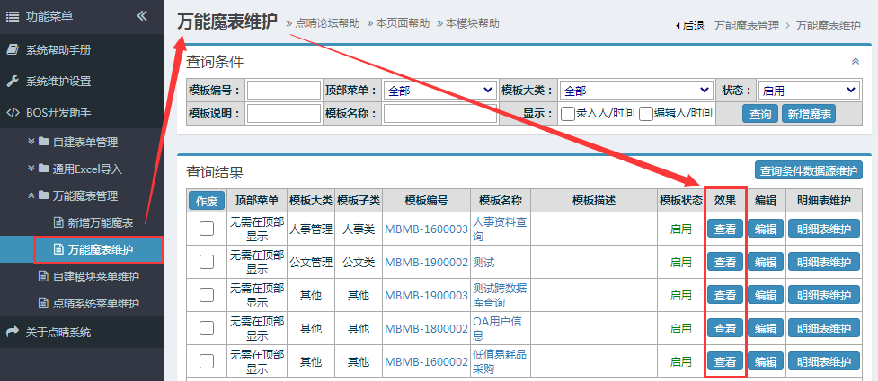 操作步驟:設置——萬能魔表管理——萬能魔表維護——點擊對應的主表后面的“明細表維護”按鈕;如下圖所示:
