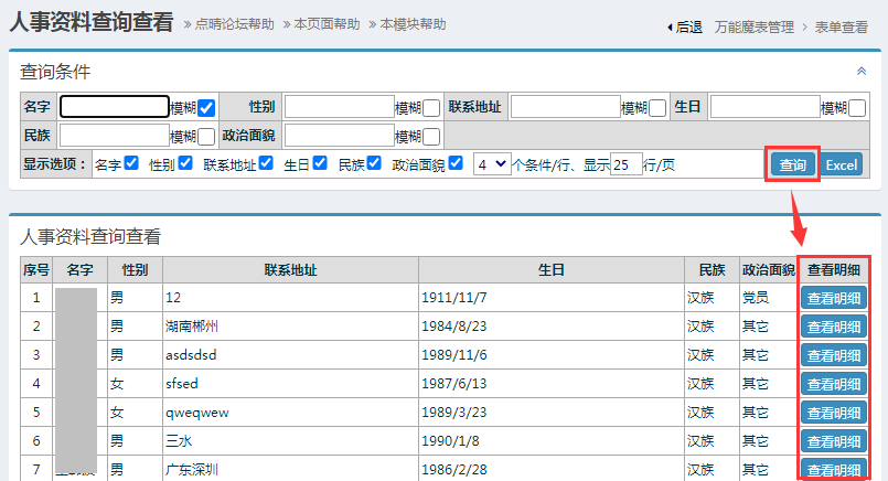 操作步驟:設置——萬能魔表管理——萬能魔表維護——選擇對應的魔表——點擊“查看” 查看界面說明: 1、查詢條件默認為精確查詢,勾選“模糊”可切換到模糊查詢; 2、頁面可自定義設置XX行/頁; 3、頁面點擊“excel”按鈕可進行excel導出。 、明細表字段查詢sql語句設置以上幾步完成了單位人員信息列表(主表)查詢設置,如果需要顯示上面每一個查詢結果的更詳細記錄:家庭成員、工作經(jīng)歷、教育經(jīng)歷等,需要繼續(xù)設置明細表查詢。