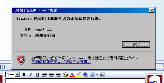 | 點晴MIS信息通PC客戶端彈出ocget.dll安全提示的解決方案