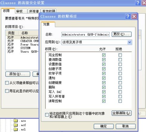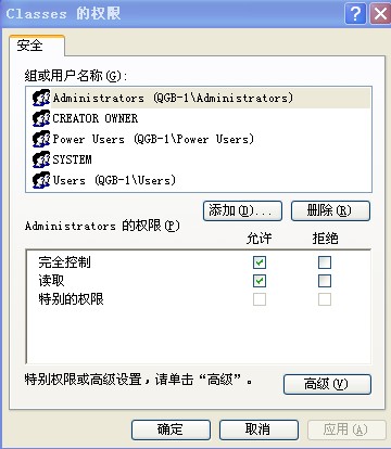 3、點(diǎn)擊Classes權(quán)限對(duì)話框中,點(diǎn)擊下方的[高級(jí)]按鈕,在[高級(jí)安全設(shè)置中],在[權(quán)限]標(biāo)簽頁(yè)中,去掉“從父向繼承那些可以。。?!边@個(gè)復(fù)選框,然后刪掉所有的權(quán)限項(xiàng)目,然后我們來(lái)恢復(fù)。 需要恢復(fù)的如下:1.用戶組users、2.Power Users、3.用戶組Administrators、4.用戶組CREATOR OWNER、5.SYSTEM 實(shí)際的權(quán)限應(yīng)該至少包括以下用戶權(quán)限: