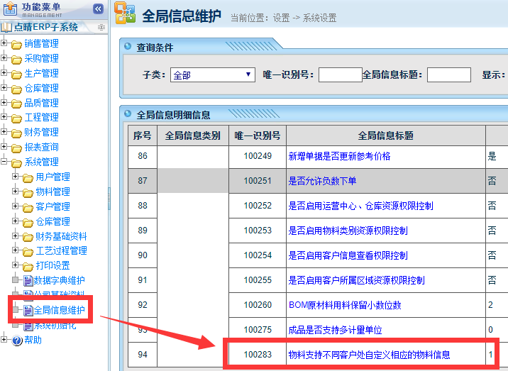 、管理員在全局信息維護(hù)中開(kāi)啟不同客戶(hù)處自定義物料信息支持:![]() 如果需要啟用本功能,則將上面這個(gè)參數(shù)設(shè)置為1,否則設(shè)置為0