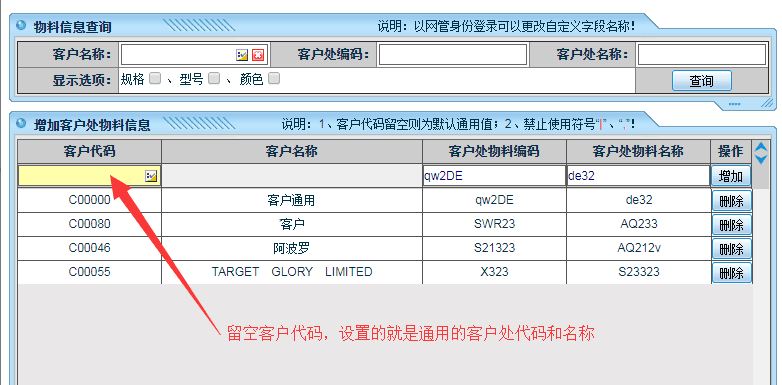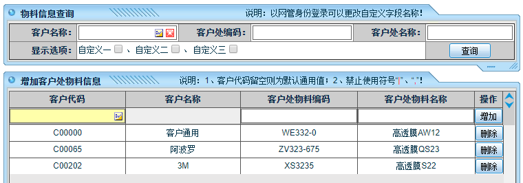 ![]() 在上面的界面中,點(diǎn)擊客戶(hù)代碼,錄入需要自定義的物料名稱(chēng)、代碼或其他自定義信息,然后點(diǎn)擊增加,就可以設(shè)置好該客戶(hù)處的自定義物料信息了。