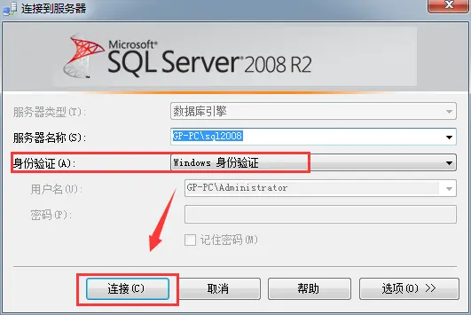 2、進(jìn)入后會彈出窗口【連接到服務(wù)器】,在【身份驗(yàn)證】選擇中【W(wǎng)indows身份驗(yàn)證】— 點(diǎn)擊【連接】(如圖1-2)。