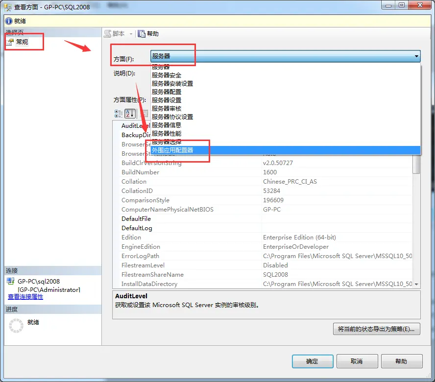 3、在數(shù)據(jù)庫服務(wù)實(shí)例名(如圖1-3,GP-PC\sql2008位置)點(diǎn)擊鼠標(biāo)右鍵【方面】。
