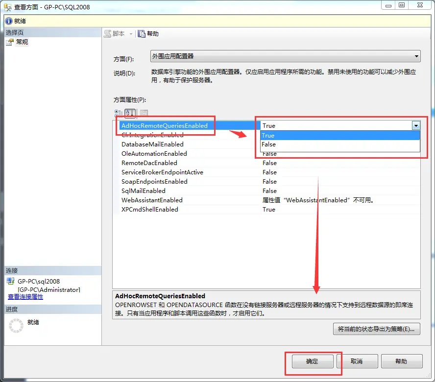 5、找到【AdHocRemoteQueriesEnabled】— 選擇【True】— 點(diǎn)擊【確定】(如圖1-5)退出后再登錄程序即可。 ![]() 相關(guān)教程: