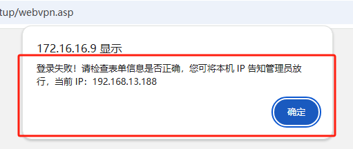 ![]() 此為webvpn登錄失敗提示,首先確保點晴MIS系統(tǒng)已經(jīng)升級到最新版(升級包下載地址:http://u.oa22.cn),或者點晴MIS系統(tǒng)至少是2024年10月份以后的版本(查看位置:點晴MIS系統(tǒng)快捷菜單-》關于本系統(tǒng))。
