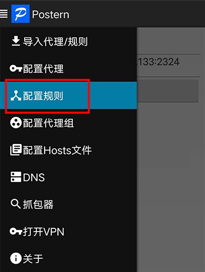 2、添加代理服務(wù)器:打開Postern后,點擊菜單按鈕-》【配置代理】-》【添加代理服務(wù)器】