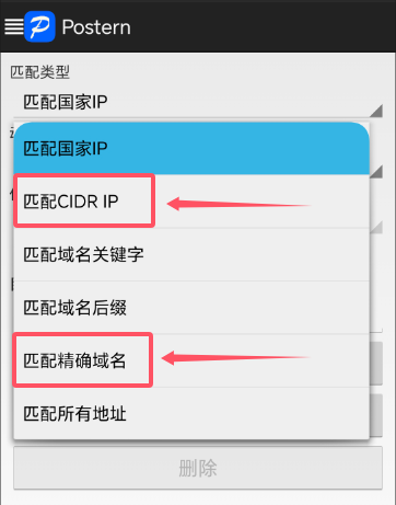 在這一步,需要注意匹配類型有六個項目:匹配國家IP、匹配CIDR IP、匹配域名關(guān)鍵字、匹配域名后綴、匹配精確域名、匹配所有地址,一般使用匹配CIDR IP或匹配精確域名。