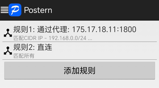 常規(guī)用法: 如果只使用了單一代理服務(wù)器并且代理服務(wù)器的內(nèi)部局域網(wǎng)IP網(wǎng)段與手機WIFI當(dāng)前本地局域網(wǎng)IP網(wǎng)段不相同(手機流量上網(wǎng)無此問題),或者使用了多組代理服務(wù)器但各個代理服務(wù)器的內(nèi)部局域網(wǎng)IP段不相同,那么需要訪問代理服務(wù)器所在局域網(wǎng)內(nèi)部的所有電腦時,應(yīng)該使用“匹配CIDR IP”,目標(biāo)地址設(shè)置為:192.168.0.0/24(假設(shè)代理服務(wù)器所在局域網(wǎng)內(nèi)部網(wǎng)段為192.168.0.*),表示這一個網(wǎng)段的所有IP都要用代理服務(wù)器中轉(zhuǎn)。 另外,需要注意postern不支持只保存一個IP,即使是這個IP地址是符合CIDR規(guī)范的格式,例如:192.168.0.8/32 就是一個符合CIDR規(guī)范格式的單一IP地址,但保存時會提示錯誤:目標(biāo)地址包含非法數(shù)據(jù),無法保存,必須按照上面這個IP網(wǎng)段或域名的方式保存。 高級用法: 如果使用了多組代理服務(wù)器并且部分代理服務(wù)器的內(nèi)部局域網(wǎng)IP網(wǎng)段相同,或者只使用了單一代理服務(wù)器但代理服務(wù)器的內(nèi)部局域網(wǎng)IP網(wǎng)段與手機WIFI當(dāng)前本地局域網(wǎng)IP網(wǎng)段相同、只需要指定的IP地址才使用代理服務(wù)器中轉(zhuǎn)(手機流量上網(wǎng)無此問題),那么需要使用“匹配精確域名”模式,利用自定義域名曲線實現(xiàn)相同IP段的精準(zhǔn)識別。例如在兩個不同代理服務(wù)器的局域網(wǎng)內(nèi)各有一個電腦,地址都是192.168.0.8,用上面“匹配CIDR IP”模式是無法區(qū)分識別這兩個IP地址的,可通過將 IP 轉(zhuǎn)換為域名的方式“欺騙”規(guī)則,分別命名為:oa11.example 和 oa22.example,用記事本修改相應(yīng)代理服務(wù)器的 hosts 文件(位置:代理服務(wù)器上C:\Windows\System32\drivers\etc\hosts)中將 oa11.example 解析到 192.168.0.8,oa22.example 解析到 192.168.0.8,如果是代理服務(wù)器自己,那么直接設(shè)置為 127.0.0.1 即可。然后設(shè)置兩條規(guī)則,都將規(guī)則設(shè)置為使用“匹配精確域名”模式,“代理/代理組”選擇相應(yīng)的代理服務(wù)器,“目標(biāo)地址”分別設(shè)置為“oa11.example”、“oa22.example”。
