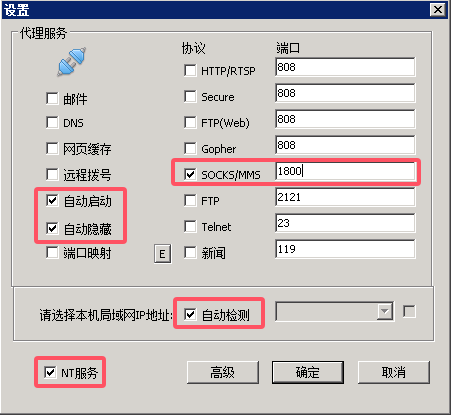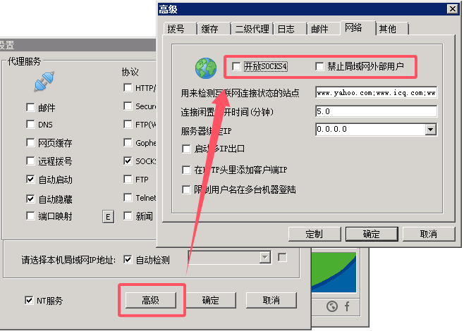 3、配置相關參數(shù),先點擊“設置”菜單圖標 ![]() 為確保安全,只使用CCProxy提供的Socks5代理功能,其余協(xié)議都不要選擇: 勾選以上紅色框中內容,其余都不要勾選,要勾選的項目為:自動啟動、自動隱藏、SOCKS/MMS、自動檢測、NT服務。 然后點擊“高級”按鈕,找到“網(wǎng)絡”,注意不要勾選:開放SOCKS4和禁止局域網(wǎng)外部用戶,如下圖所示,其余項目保持默認即可。 ![]() 確定勾選無誤后,點擊“確定”保存。 4、設置用戶名與密碼 ? 為避免其他人也可以使用我們的代理服務器,務必設置用戶名和密碼,如圖所示,點擊賬號。