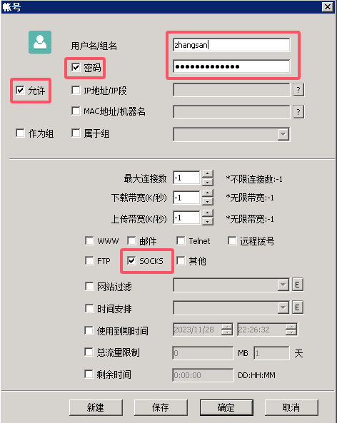 進入賬號管理頁面后,在允許范圍內選擇“允許部分”、驗證類型選擇“用戶/密碼”,再點擊“新建”。 ![]() 出現(xiàn)如圖所示的賬號對話框之后,勾選“允許”、“密碼”,協(xié)議只勾選“SOCKS”,其余項目都不要勾選,如下圖所示,設置用戶名、密碼之后,點擊“確定”保存。 5、點擊“啟動”將當前電腦設置為Socks5代理服務器開始使用