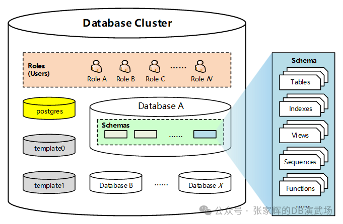 PostgreSQL的邏輯結(jié)構(gòu)PostgreSQL的邏輯結(jié)構(gòu)采用層級(jí)式設(shè)計(jì),從高到低依次為:數(shù)據(jù)庫(kù)集群→數(shù)據(jù)庫(kù)(Database)→模式(Schema)→數(shù)據(jù)庫(kù)對(duì)象(表/視圖/函數(shù)等),其中多個(gè)數(shù)據(jù)庫(kù)可以共享同一實(shí)例但它們之間相互隔離,模式作為命名空間管理對(duì)象,用戶和角色全局統(tǒng)一管理權(quán)限。??數(shù)據(jù)庫(kù)(Database)...