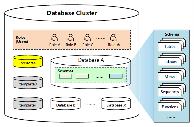 PostgreSQL的邏輯結(jié)構(gòu)采用層級式設(shè)計(jì),從高到低依次為:數(shù)據(jù)庫集群→數(shù)據(jù)庫(Database)→模式(Schema)→數(shù)據(jù)庫對象(表/視圖/函數(shù)等),其中多個數(shù)據(jù)庫可以共享同一實(shí)例但它們之間相互隔離,模式作為命名空間管理對象,用戶和角色全局統(tǒng)一管理權(quán)限。