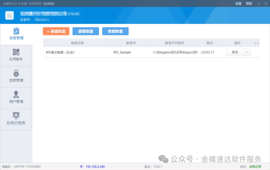 一、建賬流程1、登錄【金蝶KIS云專業(yè)版—系統(tǒng)管理】,點擊+【新建賬套】2.【系統(tǒng)信息】下填寫以下信息:賬套名稱:建議使用公司簡稱(如:XX公司2025年賬套);數(shù)據(jù)庫路徑:選擇非系統(tǒng)盤(如D盤)存儲賬套數(shù)據(jù);公司名稱:填寫全稱(用于報表打?。?;完成后點擊【下一步】3、【參數(shù)設置】下填寫以下信息:公司納稅性質(zhì):根據(jù)公司...