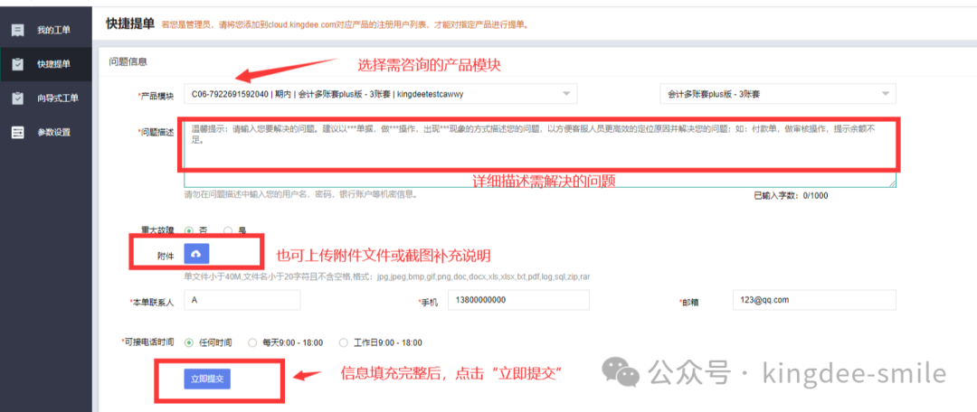 一、【解釋說明】“提交工單”系統(tǒng)可記錄您的問題,后續(xù)由工程師回電處理,可點(diǎn)擊鏈接:https://ticket.kingdee.com/直接進(jìn)入提單系統(tǒng),進(jìn)行工單提交和查詢工單處理進(jìn)度;也可通過小K咨詢界面右側(cè),點(diǎn)擊“提交工單”進(jìn)入工單系統(tǒng)。二、【提單操作】1、點(diǎn)擊鏈接:https://ticket.kingdee.c...
