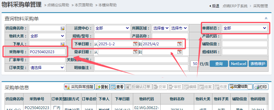 反審核操作步驟:采購(gòu)管理——采購(gòu)單管理——采購(gòu)單明細(xì)管理,進(jìn)入頁(yè)面如下圖所示:注意事項(xiàng):如果訂單中有已經(jīng)結(jié)案的明細(xì)項(xiàng)目,那么這張訂單是不允許反審駁回的。像下面這張單一共6個(gè)物料,只有一個(gè)還在“已審待執(zhí)行”狀態(tài),其余均已結(jié)案,那么這張單是不允許反審駁回的,只能將有問(wèn)題的物料行異常結(jié)案關(guān)閉,重新下單。另外,查詢時(shí)注意查詢條...