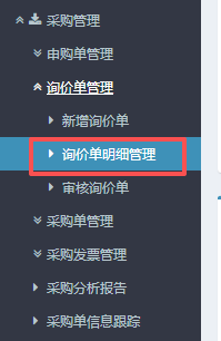 進(jìn)入ERP系統(tǒng)之后,在左側(cè)的功能菜單里找到“采購(gòu)管理”,點(diǎn)開(kāi)“詢價(jià)單管理”,點(diǎn)擊“詢價(jià)單明細(xì)管理”。
