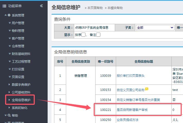 【點晴模切ERP】請問如何設(shè)置新增客戶資料審批功能?在點晴ERP系統(tǒng)-》系統(tǒng)管理-》全局信息維護中,找到唯一識別號100221:是否啟用新增客戶審核:如果不需要審核,那么勾選“不啟用客戶審核”,有權(quán)限的用戶創(chuàng)建新客戶后,就可以直接生效使用了。如果需要審核,那么勾選“啟用客戶審核”,有權(quán)限的用戶創(chuàng)建新客戶后,需要在點晴E...