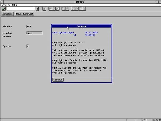 今天看到了一篇文章,上面有不少SAP30多年前的系統(tǒng)界面,有點感觸,所以寫了這篇文章?,F(xiàn)在就讓我們回到過去,時間點是1994年,可能有些讀者還未出生了。當時SAP的版本是:SAPR/32.1D,我們一起看看當時的系統(tǒng)界面,并從界面中看看當時的系統(tǒng)架構(gòu)和功能。系統(tǒng)登錄界面從下圖的登錄界面,可以看到30多年前的SAP就支持...