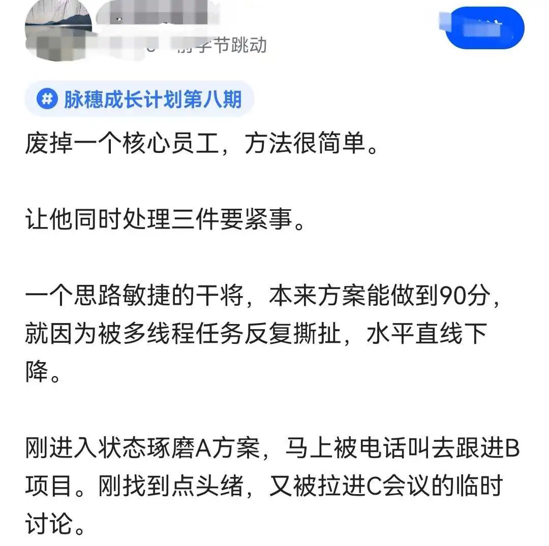01最近脈脈上有個(gè)帖子引發(fā)強(qiáng)烈共鳴:廢掉一個(gè)核心員工,方法很簡(jiǎn)單。讓他同時(shí)處理三件要緊事。這個(gè)看似平常的管理現(xiàn)象,正在成為職場(chǎng)新型慢性毒藥。就像評(píng)論區(qū)有人說(shuō)的:剛連上設(shè)備排查問(wèn)題2分鐘,接個(gè)電話回來(lái)就登錄超時(shí)了——這種日常崩潰,正在摧毀現(xiàn)代職場(chǎng)人的核心競(jìng)爭(zhēng)力。多線程工作的致命陷阱:你的大腦不是CPU帖子中那個(gè)精準(zhǔn)的比喻...