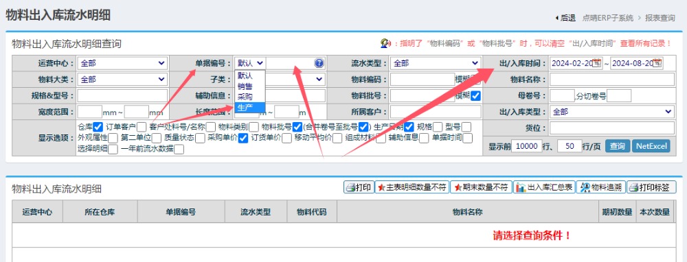 【點(diǎn)晴模切ERP】如何實(shí)現(xiàn)以生產(chǎn)工單號(hào)查詢(xún)到對(duì)應(yīng)的物料使用批次,便于查詢(xún)和追溯物料異常的范圍進(jìn)入倉(cāng)庫(kù)管理-》物料流向管理-》物料出入庫(kù)流水明細(xì)中(如果看不到此菜單,則應(yīng)該向管理員申請(qǐng)開(kāi)放此菜單訪問(wèn)權(quán)限):在物料出入庫(kù)流水明細(xì)查詢(xún)頁(yè)面,根據(jù)實(shí)際需要查詢(xún)的單據(jù)類(lèi)型,選擇單據(jù)編號(hào)中的類(lèi)型為:銷(xiāo)售/采購(gòu)/生產(chǎn),然后輸入銷(xiāo)售單/...