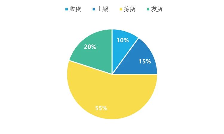 做了這么多年的倉(cāng)庫(kù)工作,你知道在倉(cāng)庫(kù)工作中,哪一項(xiàng)工作最耗時(shí)嗎?如果你還不清楚,請(qǐng)繼續(xù)往下看。有一項(xiàng)數(shù)據(jù)統(tǒng)計(jì)表明,如果把倉(cāng)庫(kù)的總工作量當(dāng)做100%的話,那么倉(cāng)庫(kù)各項(xiàng)工作耗時(shí)占比如下。如上的扇形圖可以看出,“揀貨”這項(xiàng)工作占據(jù)了倉(cāng)庫(kù)工作中一半以上的工作時(shí)間,如何優(yōu)化揀貨環(huán)節(jié),對(duì)提高倉(cāng)庫(kù)效率有著關(guān)鍵性作用。如果將“揀貨”這...