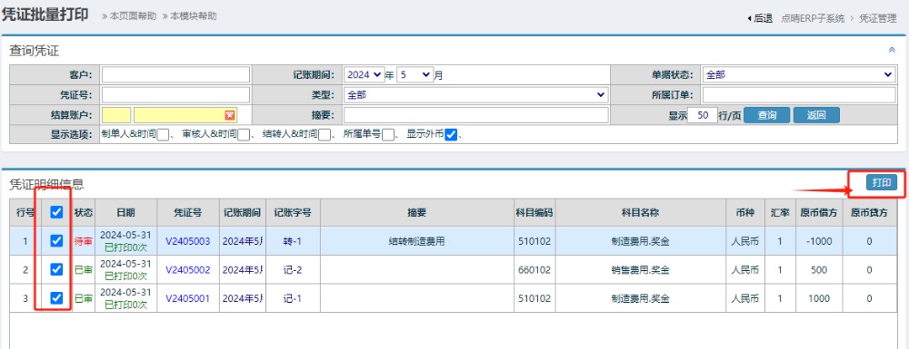 【點(diǎn)晴模切ERP】財(cái)務(wù)管理模塊中如何批量打印憑證??進(jìn)入總賬系統(tǒng),選擇”憑證管理“--》點(diǎn)擊”批量打印“。勾選需要打印的憑證,點(diǎn)擊”打印“按鈕,進(jìn)入打印預(yù)覽后,選擇打印即可。