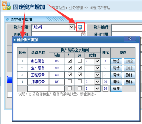 :固定資產(chǎn)管理能自定義類別嗎?如何刪除已經(jīng)存在的類別?![]() 可以,以管理員身份進(jìn)入固定資產(chǎn)管理新增頁面,就會看到固定資產(chǎn)類別維護(hù)按鈕,普通用戶沒有權(quán)限維護(hù)固定資產(chǎn)類別: ![]() 上面的辦公設(shè)備和生產(chǎn)設(shè)置是系統(tǒng)預(yù)置類別,必須保留,禁止更改。其余類別可以根據(jù)實(shí)際情形自行增刪。