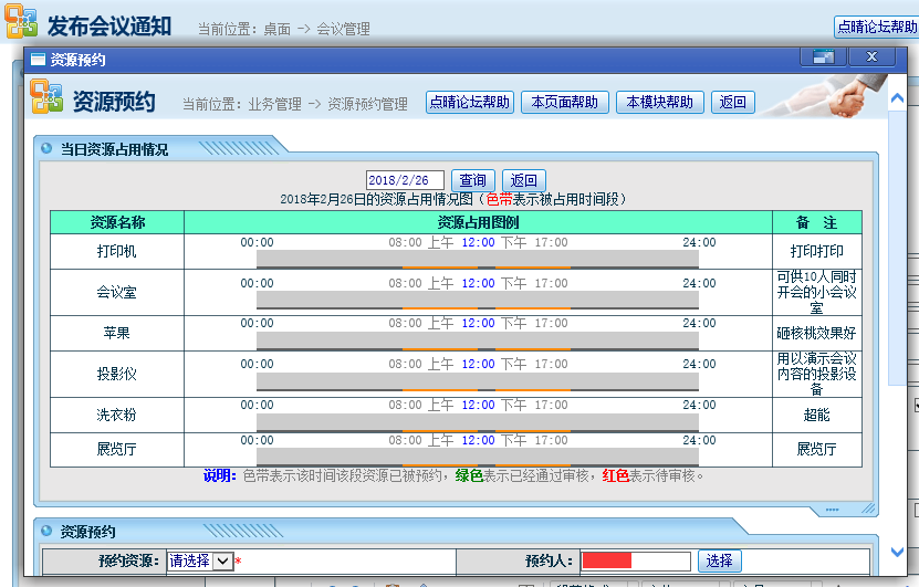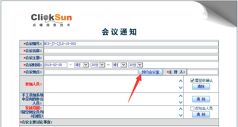 :點(diǎn)晴OA中在哪里可以進(jìn)行會(huì)議室預(yù)約管理???![]() 在資源管理中,先創(chuàng)建會(huì)議室,然后設(shè)置審批路線,就可以進(jìn)行會(huì)議室預(yù)約管理了。 在發(fā)布會(huì)議通知的時(shí)候,可以直接點(diǎn)擊按鈕預(yù)約會(huì)議室: 相關(guān)教程: