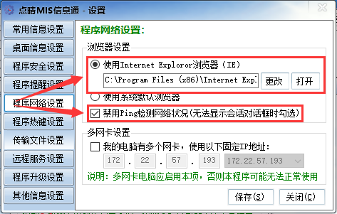 ![]() ![]() ![]() 出現(xiàn)這個(gè)提示的原因是用戶電腦上的IE瀏覽器被該電腦上的垃圾軟件360或搜狗惡意破壞了,導(dǎo)致使用默認(rèn)路徑無(wú)法打開(kāi)IE瀏覽器,點(diǎn)擊點(diǎn)晴MIS信息通設(shè)置-》程序網(wǎng)絡(luò)設(shè)置,選擇“使用系統(tǒng)默認(rèn)瀏覽器”,或者升級(jí)點(diǎn)晴MIS信息通到最新版,上面會(huì)出現(xiàn)直接指定IE瀏覽器位置的項(xiàng)目,更改后保存,退出點(diǎn)晴MIS信息通,重新打開(kāi)登錄,就會(huì)發(fā)現(xiàn)能夠正常打開(kāi)瀏覽器了: ![]() 如果還是打不開(kāi),那么將下面那個(gè)“禁用Ping檢測(cè)網(wǎng)絡(luò)狀況”也勾選即可: ![]() 該文章在 2018/10/10 16:27:12 編輯過(guò) |
