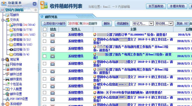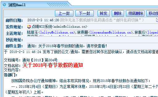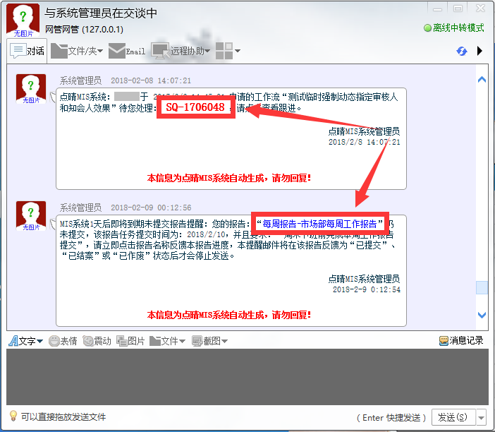 點晴OA系統(tǒng)中各類新信息提醒在現(xiàn)有Email提醒的基礎(chǔ)上,增加一種提醒方式:信息通短信和手機(jī)APP實時提醒,新信息響應(yīng)速度更為快捷,管理員可以在系統(tǒng)全局變量中找到系統(tǒng)新信息提醒方式設(shè)置,自行確定選用Email或是信息通短信提醒。 設(shè)置方法如下: ![]() 前后效果變化: ![]() ![]() 以前用Email方式實現(xiàn)新信息提醒和審批等,新信息和其他郵件混雜在一起,而且需要進(jìn)入后再兩次點擊才去到真正的審批界面,效率較低,而且不直觀,查找麻煩。 現(xiàn)在在信息通短信界面中直接顯示,效率高,直觀,由admin網(wǎng)管賬戶直接發(fā)出: ![]() 點晴MIS信息通PC客戶端效果,新信息直接彈出,點擊即可審批。 手機(jī)APP效果,手機(jī)APP會自動彈出新信息提醒,點擊進(jìn)入后直接看到相關(guān)提醒。 相關(guān)教程: ![]() ![]() http://9057.oa22.cn 該文章在 2018/4/25 16:01:18 編輯過 |