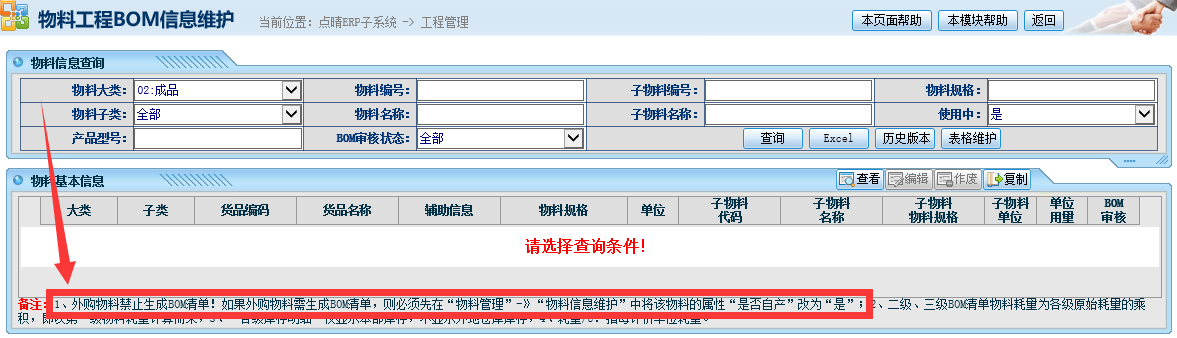 :為什么我在ERP系統(tǒng)中增加的新成品物料,工程人員反饋說找不到這個物料,無法進行BOM設(shè)置操作,是什么原因造成的?![]() ![]() 首先,要確保該物料已經(jīng)成功創(chuàng)建。在:ERP系統(tǒng)-》系統(tǒng)管理-》物料管理-》物料信息維護 中,一定要能找到該物料。 ![]() 然后,在:ERP系統(tǒng)-》工程管理-》生產(chǎn)BOM管理 頁面,注意查詢條件是否設(shè)置有誤?將所有約束條件都去除看看。 ![]() 另外,要注意:點晴ERP-》工程管理-》生產(chǎn)BOM管理 頁面最下面的說明: