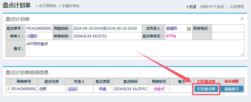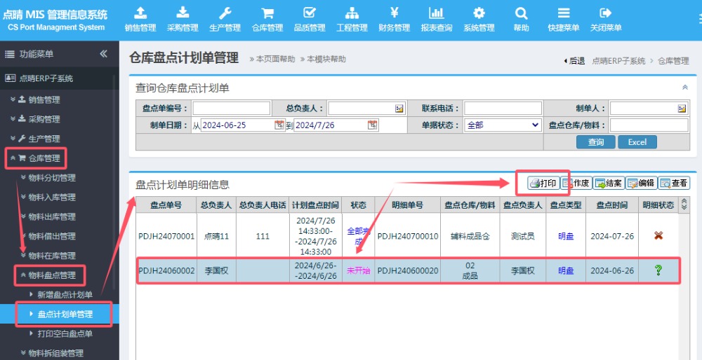 先確認(rèn)本崗位已經(jīng)開通點(diǎn)晴業(yè)務(wù)通APP倉庫盤點(diǎn)功能,如果在手持終端或智能手機(jī)點(diǎn)晴業(yè)務(wù)通APP中看不到倉庫盤點(diǎn)菜單,聯(lián)系管理員,對本崗位手持終端開通倉庫盤點(diǎn)功能。 1、進(jìn)入手持終端業(yè)務(wù)通的盤點(diǎn)功能,選擇需要的盤點(diǎn)類型: 選中需要盤點(diǎn)的倉庫: 然后找到對應(yīng)倉庫物料,進(jìn)行標(biāo)簽掃碼盤點(diǎn),如果掃碼的結(jié)果與實(shí)際不一樣,可以修改然后保存修改記錄。如果掃碼結(jié)果與實(shí)物一直,則繼續(xù)掃下一個標(biāo)簽,無需進(jìn)行其他操作,繼續(xù)掃碼即可。 2、進(jìn)入ERP盤點(diǎn)模塊,打印 盤點(diǎn) 或者 導(dǎo)出 excel 盤點(diǎn)表,倉庫管理--》盤點(diǎn)管理--》選擇盤點(diǎn)計劃單--》打?。?br>