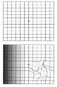 正常的眼睛看到的就是棋盤(pán)橫平豎直的格子 但是 如果中心點(diǎn)周?chē)霈F(xiàn)空缺或曲線, 很可能是眼睛的黃斑出了問(wèn)題! 比如如果看到這樣的圖: