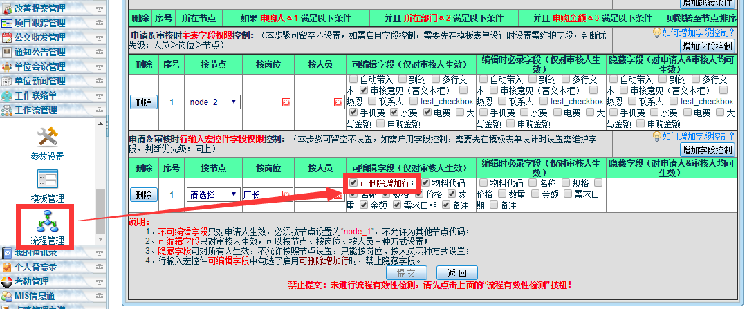 ![]() 使用方法,進(jìn)入流程設(shè)計(jì)管理界面: ![]() 在“可編輯字段”中,可以看到有一個(gè)“口可刪除增加行”的項(xiàng)目,勾選后,前面指定的審核人就可以在審核時(shí),動(dòng)態(tài)刪除行輸入宏控件中的行次或新增行次了。 注意,勾選了這個(gè)項(xiàng)目后,隱藏字段就會(huì)自動(dòng)失效,也即不允許隱藏任何字段。 另外,勾選了這個(gè)項(xiàng)目后,審核人在編輯時(shí),刪除的行次信息就會(huì)被徹底刪除,無(wú)法找回申請(qǐng)人填寫(xiě)的內(nèi)容! 該文章在 2019/1/23 17:25:29 編輯過(guò) |