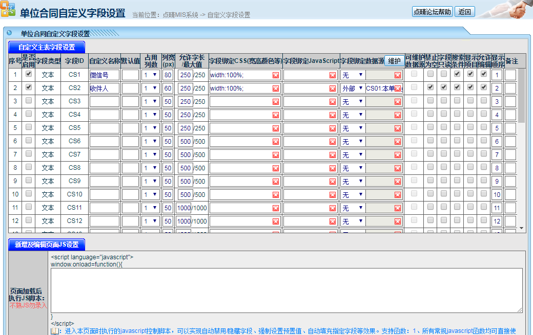 目前增加了自定義字段的有通訊錄、單位合同管理、車(chē)輛預(yù)約管理、改善提案管理、人力資源管理、低值易耗品管理、固定資產(chǎn)管理、圖書(shū)管理、項(xiàng)目追蹤管理、EBR費(fèi)用預(yù)算及報(bào)銷(xiāo)管理等模塊。 開(kāi)啟使用方法: 以管理員身份登錄點(diǎn)晴OA,進(jìn)入相應(yīng)功能模塊,在新增頁(yè)面或列表頁(yè)面上,找到“自定義字段管理”按鈕: ![]() 說(shuō)明:?jiǎn)挝煌ㄓ嶄?、個(gè)人通訊錄、外部通訊錄,均支持增加自定義字段。 ![]() 單位合同管理-》基礎(chǔ)信息設(shè)置-》自定義字段管理 在以上位置找到并點(diǎn)擊按鈕“自定義字段管理”,設(shè)置需要增加的字段: ![]() ![]() 請(qǐng)仔細(xì)觀(guān)察以上界面,可以設(shè)置增加的字段類(lèi)型、長(zhǎng)度、綁定CSS和JS、設(shè)置只讀、是否允許編輯等,并且可以在頁(yè)面上設(shè)置各種JS效果,實(shí)現(xiàn)各種需求: 1、序號(hào):就是序號(hào); 2、是否啟用:如需要使用本字段,就要勾選啟用; 3、字段類(lèi)型:系統(tǒng)內(nèi)置不可選,共20個(gè)文本型(5個(gè)250字長(zhǎng)、5個(gè)500字長(zhǎng)、4個(gè)1000字長(zhǎng)、3個(gè)2000字長(zhǎng)、3個(gè)4000字長(zhǎng))、5個(gè)數(shù)字型、5個(gè)日期型、5個(gè)富文本型(可上傳圖片和附件); 4、字段ID:系統(tǒng)內(nèi)置不可更改,文本型CS開(kāi)頭、數(shù)字型number開(kāi)頭、日期型time開(kāi)頭、富文本型ntext開(kāi)頭,后面帶流水號(hào),頁(yè)面上如果使用了JS效果,需要根據(jù)此ID獲取相應(yīng)控件; 5、自定義名稱(chēng):對(duì)外顯示的中文名稱(chēng),一般控制在4個(gè)字以?xún)?nèi)為宜,如果勾選啟用,則本字段必填; 6、默認(rèn)值:新增時(shí),本控件預(yù)置的值,一般留空即可,如果是數(shù)字型的話(huà),建議默認(rèn)值為0; 7、占用列數(shù):系統(tǒng)內(nèi)置值1/3/5/7/9,配合字段中文名稱(chēng),占用列數(shù)加1,一般數(shù)字型和時(shí)間型強(qiáng)制為占用1列,文本型可以根據(jù)實(shí)際需求增加列數(shù),例如字段為送貨地址時(shí),可以占用3列或5列; 8、列寬(px):本項(xiàng)用于列表查詢(xún)頁(yè)面,不用于新增和編輯頁(yè)面,可以控制在列表查詢(xún)頁(yè)面中需要占用的寬度,用px記錄絕對(duì)列寬; 9、允許字長(zhǎng)/最大值:本項(xiàng)用于控制不允許錄入太長(zhǎng)的內(nèi)容,用于文本型和數(shù)字型控件,后面最大值是允許使用的最大位數(shù); 10、字段綁定CSS(寬高顏色等):本項(xiàng)用于控制控件的CSS效果,例如控件寬度、高度、里面內(nèi)容的字體顏色、大小、背景色等,一般至少應(yīng)該包括“width:100%;”,也就是控件滿(mǎn)寬顯示; 11、字段綁定JavaScript:本項(xiàng)用于控制控件是否需要使用JS來(lái)實(shí)現(xiàn)一些特殊的效果,例如只允許輸入數(shù)字、英文、自動(dòng)計(jì)算、自動(dòng)取值等; 12、字段綁定數(shù)據(jù)源:本項(xiàng)用于控制控件是否需要自動(dòng)填充內(nèi)容,數(shù)據(jù)可以來(lái)源于直接自定義,也可以來(lái)源內(nèi)部或外部其他數(shù)據(jù)庫(kù)表,使用方法與工作流自定義SQL數(shù)據(jù)源一致; 13、可維護(hù)數(shù)據(jù)源:本項(xiàng)用于如果是直接自定義數(shù)據(jù)源時(shí),是否允許新增時(shí)制單人自行維護(hù)數(shù)據(jù)源,勾選了,那么制單人就可以自行維護(hù)數(shù)據(jù)源,否則就只能使用網(wǎng)管事先預(yù)置的數(shù)據(jù)源; 14、禁止為空:本項(xiàng)控制操作人提交內(nèi)容時(shí),本控件內(nèi)容是否允許為空,如果勾選了,那么提交時(shí)本控件就必須有內(nèi)容才允許提交; 15、字段只讀:本項(xiàng)控制控件是否允許操作人手工輸入內(nèi)容,如果勾選了,那么操作人要么徹底禁止錄入本控件,要么只能點(diǎn)擊選擇綁定的數(shù)據(jù)源自動(dòng)填充數(shù)據(jù),靈活運(yùn)用本字段,可以實(shí)現(xiàn)精確控制的效果; 16、搜索條件:本項(xiàng)目控制本字段是否在查詢(xún)列表中,作為搜索條件使用,本項(xiàng)目在新增和編輯頁(yè)面無(wú)效,只可用于列表查詢(xún)頁(yè)面; 17、顯示項(xiàng)目:本項(xiàng)目控制本字段是否在查詢(xún)列表中,作為顯示條件使用,本項(xiàng)目在新增和編輯頁(yè)面無(wú)效,只可用于列表查詢(xún)頁(yè)面; 18、允許編輯:本項(xiàng)目控制本字段在編輯頁(yè)面中是否允許操作人更改字段內(nèi)容,如果未勾選,則操作人無(wú)法更改本字段內(nèi)容; 19、顯示順序:本項(xiàng)目控制各個(gè)被勾選的字段在新增、編輯、查看、列表查詢(xún)頁(yè)面中的字段顯示順序,從小到大升序顯示各個(gè)字段; 20、備注:就是各個(gè)項(xiàng)目的備注了; 21、頁(yè)面加載后執(zhí)行JS腳本:進(jìn)入頁(yè)面時(shí)執(zhí)行的JS腳本,可以用于強(qiáng)制禁用某個(gè)字段、給某給字段賦值、更改某給字段的CSS效果等; 22、表體JS腳本:一般放入JS的function函數(shù),用于頁(yè)面上控件綁定的JS腳本調(diào)用; 23、頁(yè)面提交前執(zhí)行JS腳本:一般用于頁(yè)面提交前判斷控件內(nèi)容是否符合要求、自動(dòng)計(jì)算某些控件內(nèi)容等。 以下是增加字段后的新增、編輯、查看列表效果: ![]() 新增界面增加的自定義字段效果 ![]() 編輯頁(yè)面增加的自定義字段效果 ![](