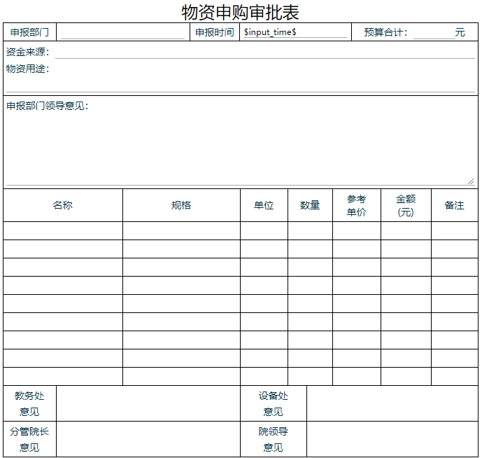 工作流設(shè)計(jì)中,最麻煩的就是表單模板設(shè)計(jì),一般需要熟悉HTML和CSS語法才能獲得完美的表單效果。為了簡(jiǎn)化復(fù)雜表單模板設(shè)計(jì),點(diǎn)晴OA工作流模板設(shè)計(jì)中引入了表格控件模板,可以比較方便設(shè)計(jì)出復(fù)雜的表格樣式,而不需要了解太多的HTML和CSS知識(shí)。 下面以這個(gè)《物資申購(gòu)審批表》為例說明如何設(shè)計(jì):