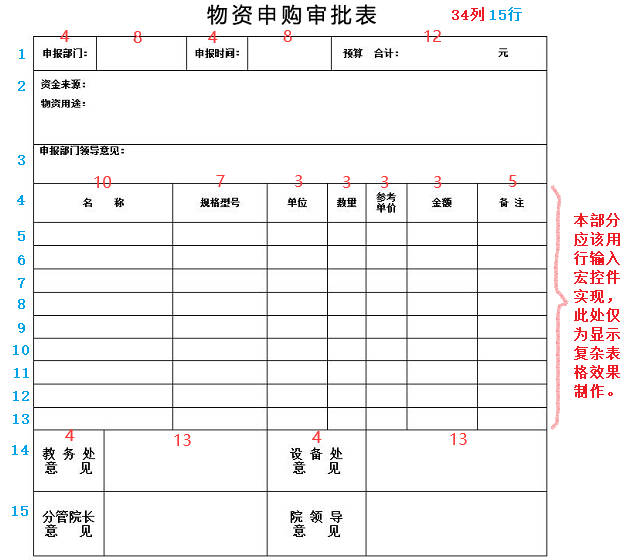 ![]() 2、設(shè)計(jì)表格前,應(yīng)該研究此表格構(gòu)成,像上面這個(gè)表格,一共是15行,因?yàn)椴捎昧丝v向設(shè)計(jì),縱向時(shí)單元格一共有34列,要考慮如何分配各列占用的單元格列數(shù)為宜,下面紅色數(shù)字是此列單元格計(jì)劃占用的列數(shù)、藍(lán)色數(shù)字為計(jì)劃占用的行數(shù),所以上面表格模板控件會(huì)話框中表格列數(shù)應(yīng)該用縱向34列、表格行數(shù)為15行: