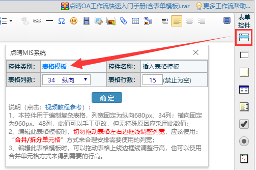 1、如果設(shè)計(jì)復(fù)雜表單模板,務(wù)必使用右上角的插入表單模板控件方式插入表單模板,插入的表格是由列寬20px、行高26px的單元格組成,表格列數(shù)和表格行數(shù)的確認(rèn)參見下面的說明: