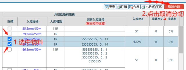 ![]() 圖:1 6. 如果發(fā)現(xiàn)物料分切信息出現(xiàn)錯誤或想要更改的話,進行以下操作:在該頁面下選中需要更改物料的分切信息,選中后點擊”取消分切” 取消分切后,該物料會回到未分切的狀態(tài),需要重新對物料進行分切,即重復(fù)一次步驟3的操作.