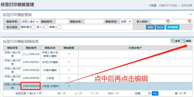 ![]() 3. 在新頁面拉到最下面,直接點(diǎn)擊編輯,然后再到打印標(biāo)簽界面選擇該模板 如下圖:
